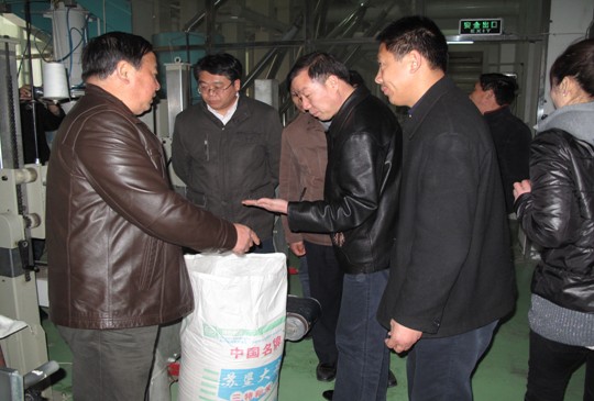 于国民副局长来到储备库、烘干线、大米加工车间和成品库,了解公司的整体运营情况,随后又察看了物流建设所需的码头地理位置和有关河道。在会议室,项总从占地面积、物流园区区位划分等方面介绍了黄海物流园建设的构想。听了项总的介绍加上现场考察,于局长表示,要在米产品、米产业、米深加工、稻谷的精优生产及品种的选优、质量的提高等方面,让农垦成为农业生产技术水平聚焦的集中区;另外,物流园区规划区域合理,可以在原有的基础上拓展延伸,在黄海做成稻米产业园区。 图为于国民副局长一行在黄海公司考察